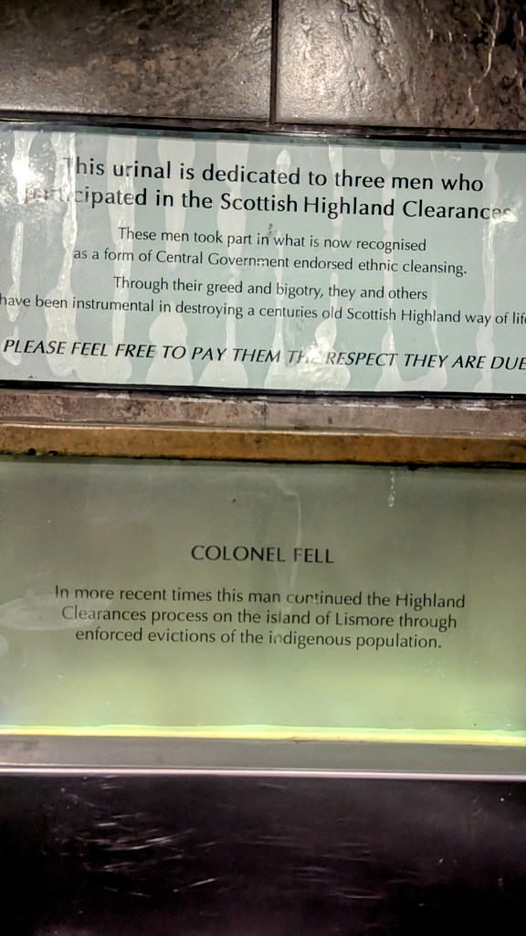 The urinals are dedicated to those who suffered in the Highland clearances. I’m tempted to cheer Colonel Fell but as the lone Sassenach in a pub of Scots I choose to just p**s on his name.