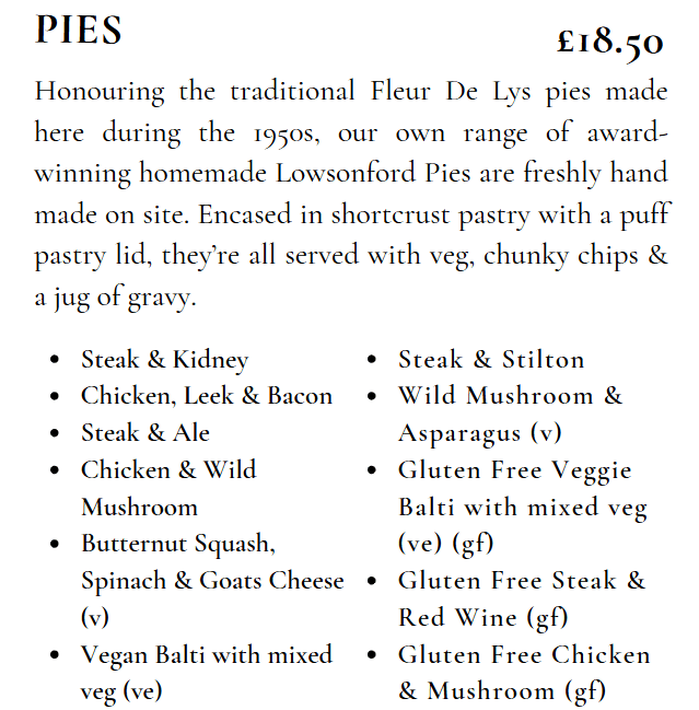 The Fleur de Lys is the home of the eponymous pies, a style I’ve never heard of but no doubt one of you will inform me.