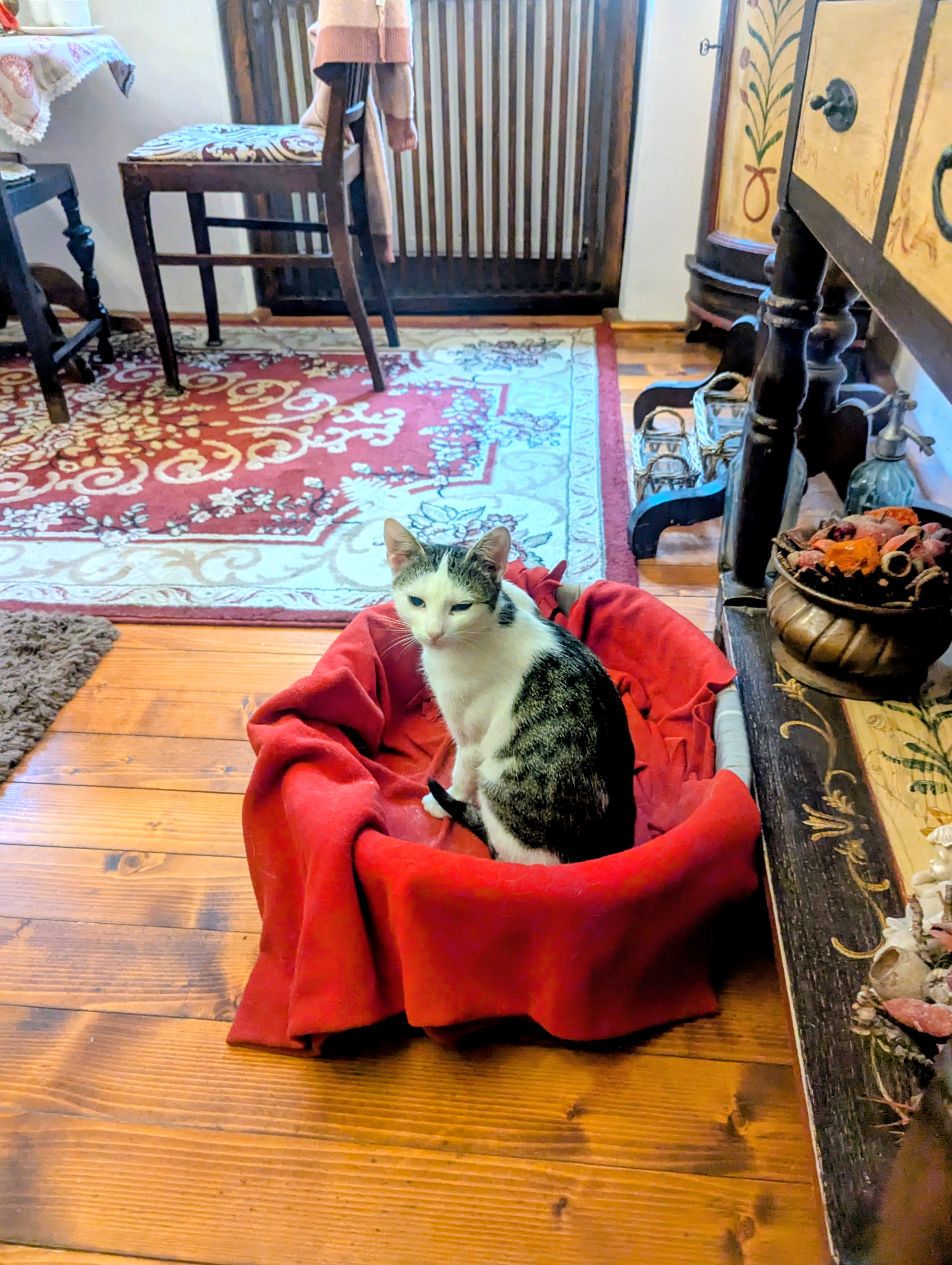 A few reviews had mentioned that the breakfast didn’t include drinks, “you’ll pay extra for coffee at Paris prices“. wrote one traveller. Few folk mentioned the cat that woke us at 9am, the prescribed breakfast hour.