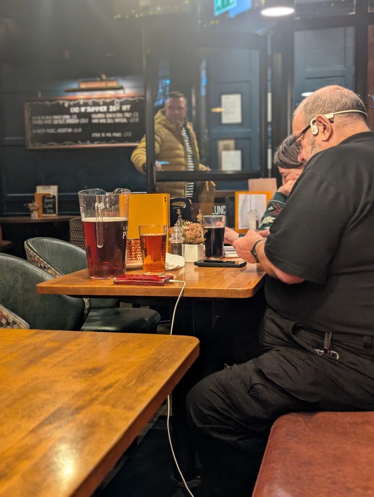 “by which time the chap to my right might just have finished his 4 pint jug of Pride,”