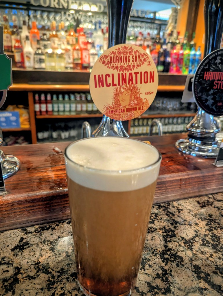 Mrs RM, who’d announced she was never drinking again after Sunday night, declares that Bateman Dark Fruits Porter “mmmm, get off” (3.5), my Burning Sky Inclination is so almost perfect (4.5) I’m inclined to stay for another,