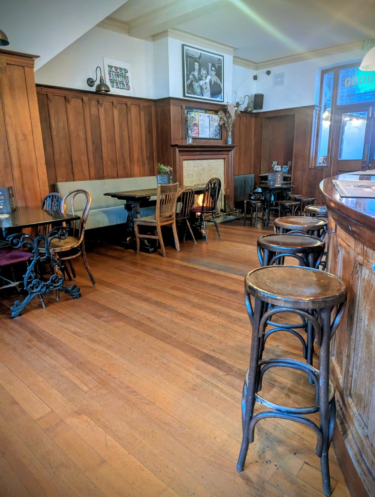 The Piper is a south-east London style cosy corner pub, music posters and brown wood,