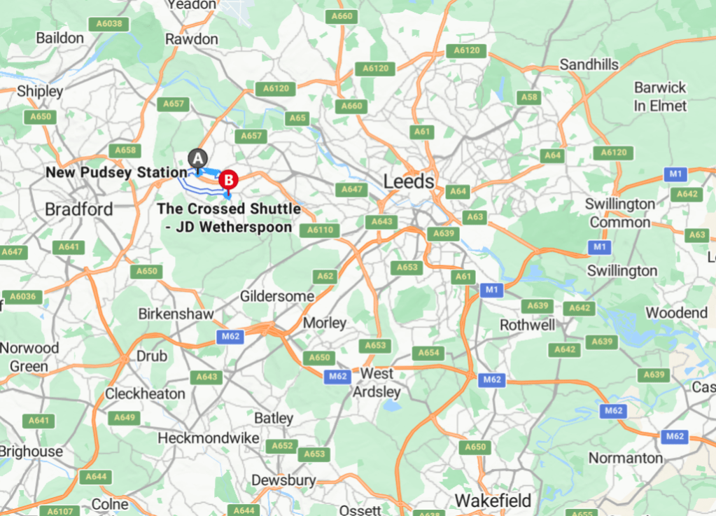 (wait, my bad, it’s 1.3 miles from the Crossed Shuttle to the Bramley station)