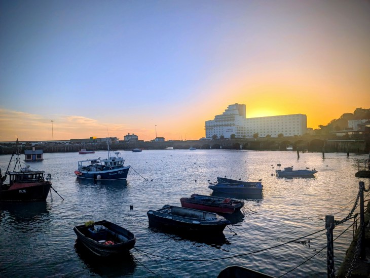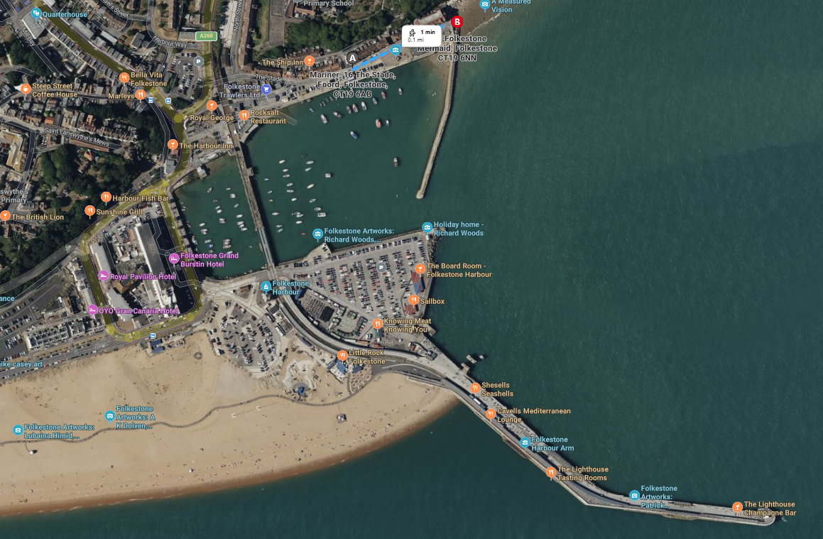 Leaving Folkestone Harbour Arm, with its scary giant seagulls that look like they’ve escaped from Squid Games,