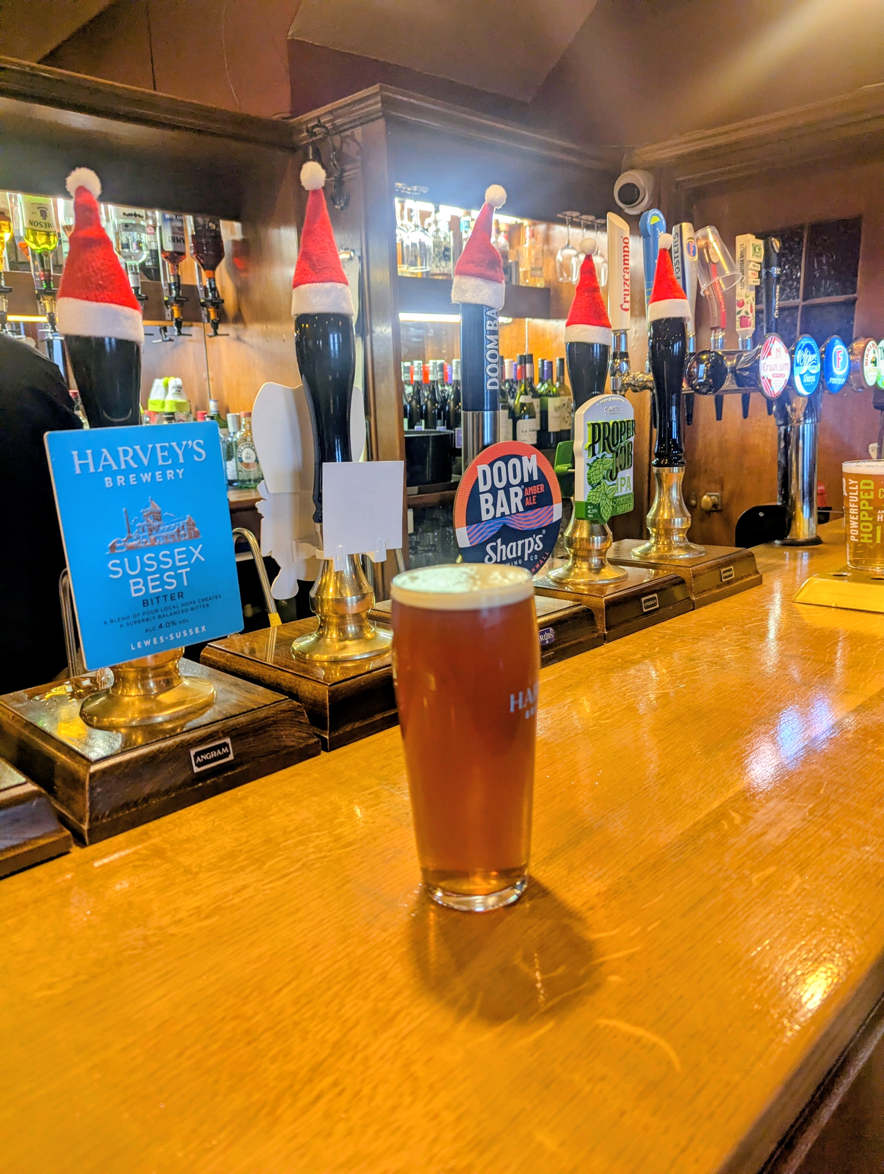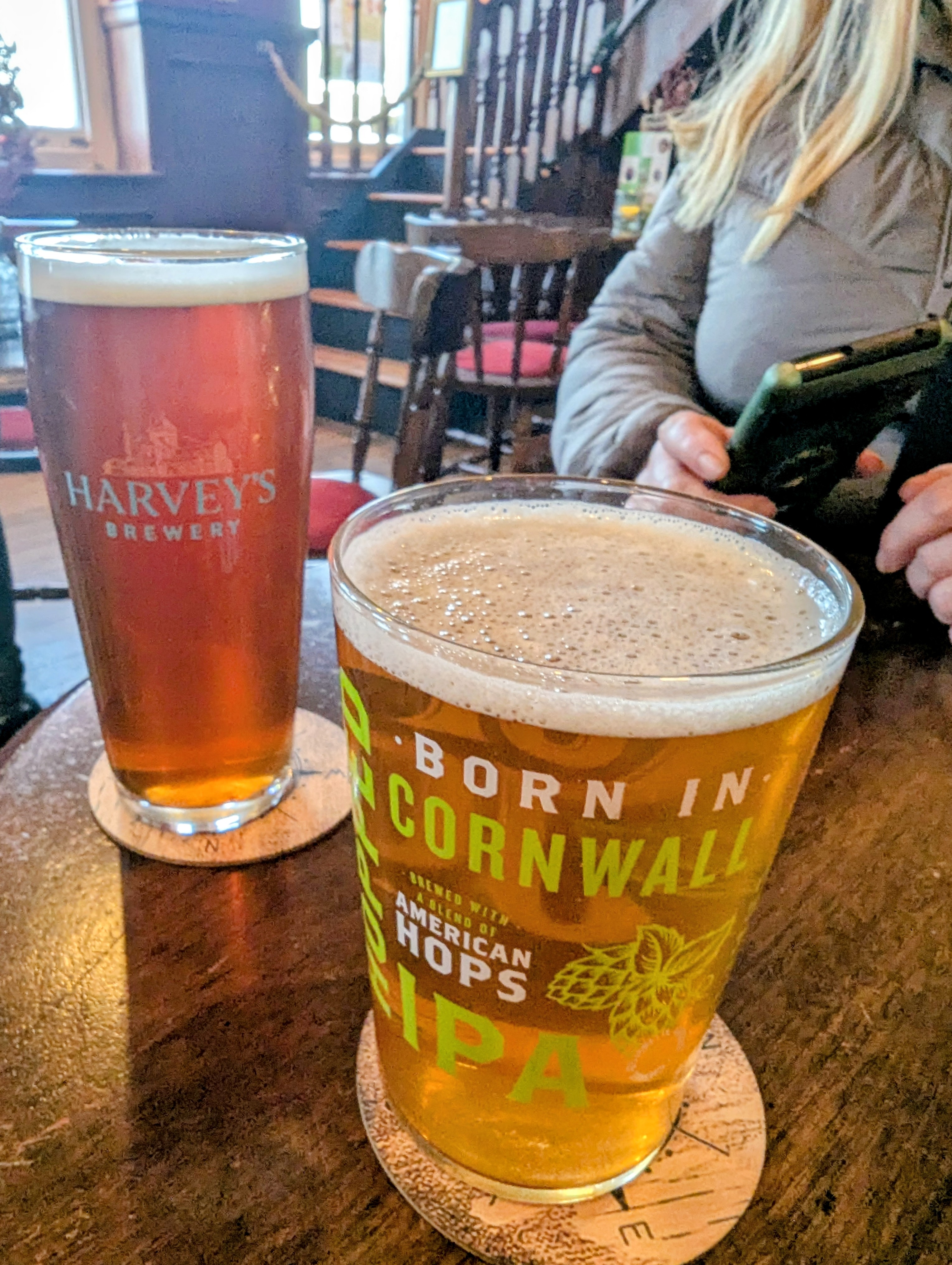 Mrs RM had apparently shouted “We’ll share a pint” as she nipped in, with me 150 yards ahead, but frankly I’d never share anything with her, and the Sussex Best and Proper Job look gorgeous in branded glasses.