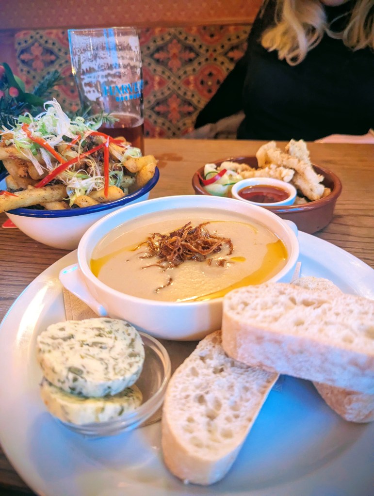 “The soup’s really good” says the Old Boy on his 3rd glass of white wine (“just buy the flipping bottle” hisses Mrs RM) and he’s right.