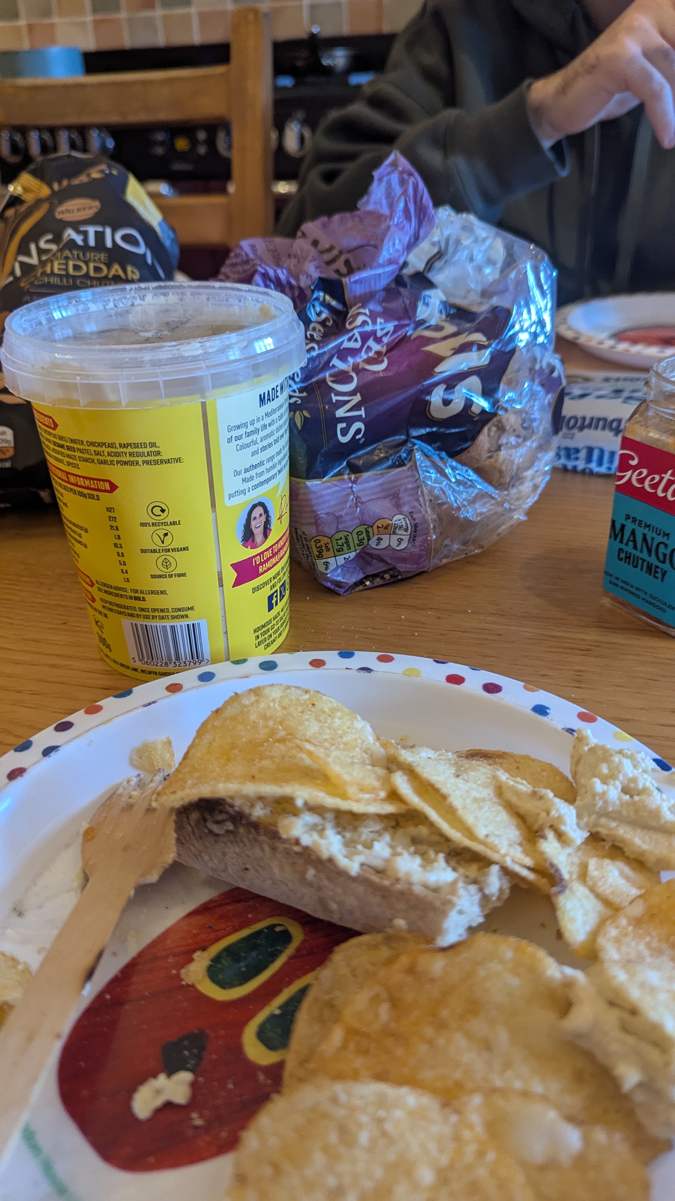 houmous, Sensations crisps, mango chutney, baguette and some stew Mrs RM knocked up in the slow cooker this morning. Eaten off childrens party plates with wooden cutlery “borrowed” from Waitrose.