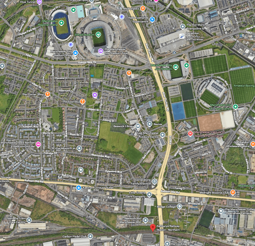 Note, map above, the astonishing number of sports stadia in East Manchester, a legacy of the Commonwealth Games of 2002 and the totally above board Abu Dhabi investment.