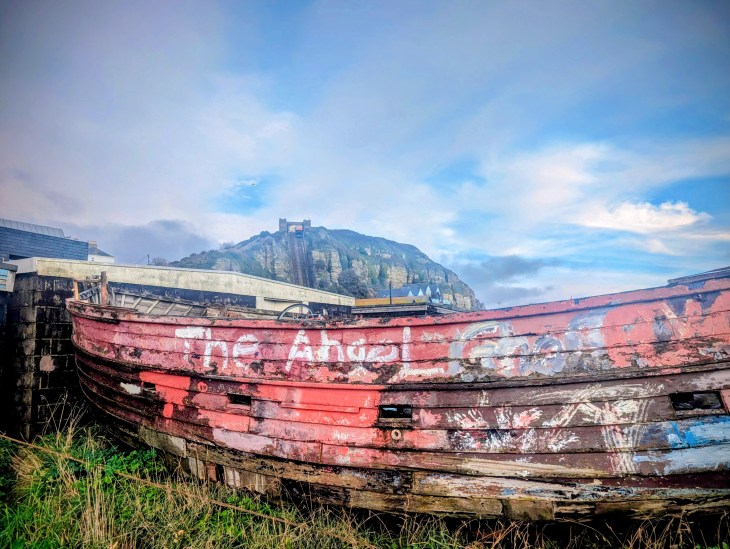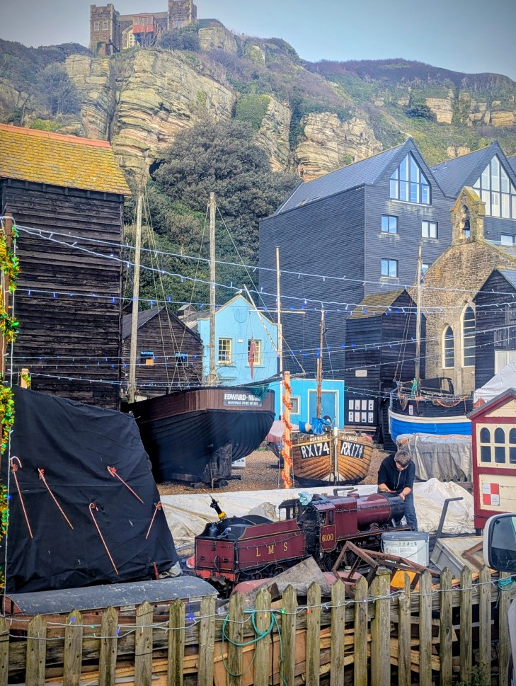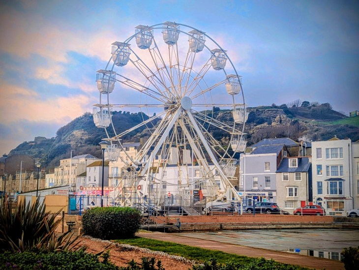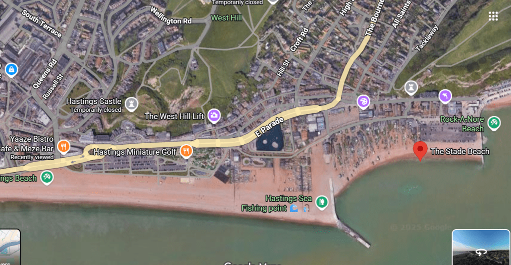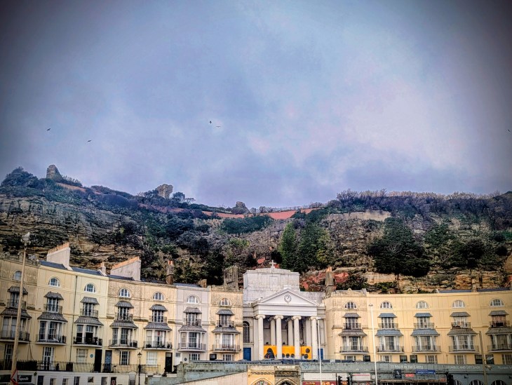The next post-lunch stretch takes us from the brutalism of Sports Direct in Hastings New Town, past that iconic view of Pelham Crescent’s amusement arcades with the castle ruins behind,