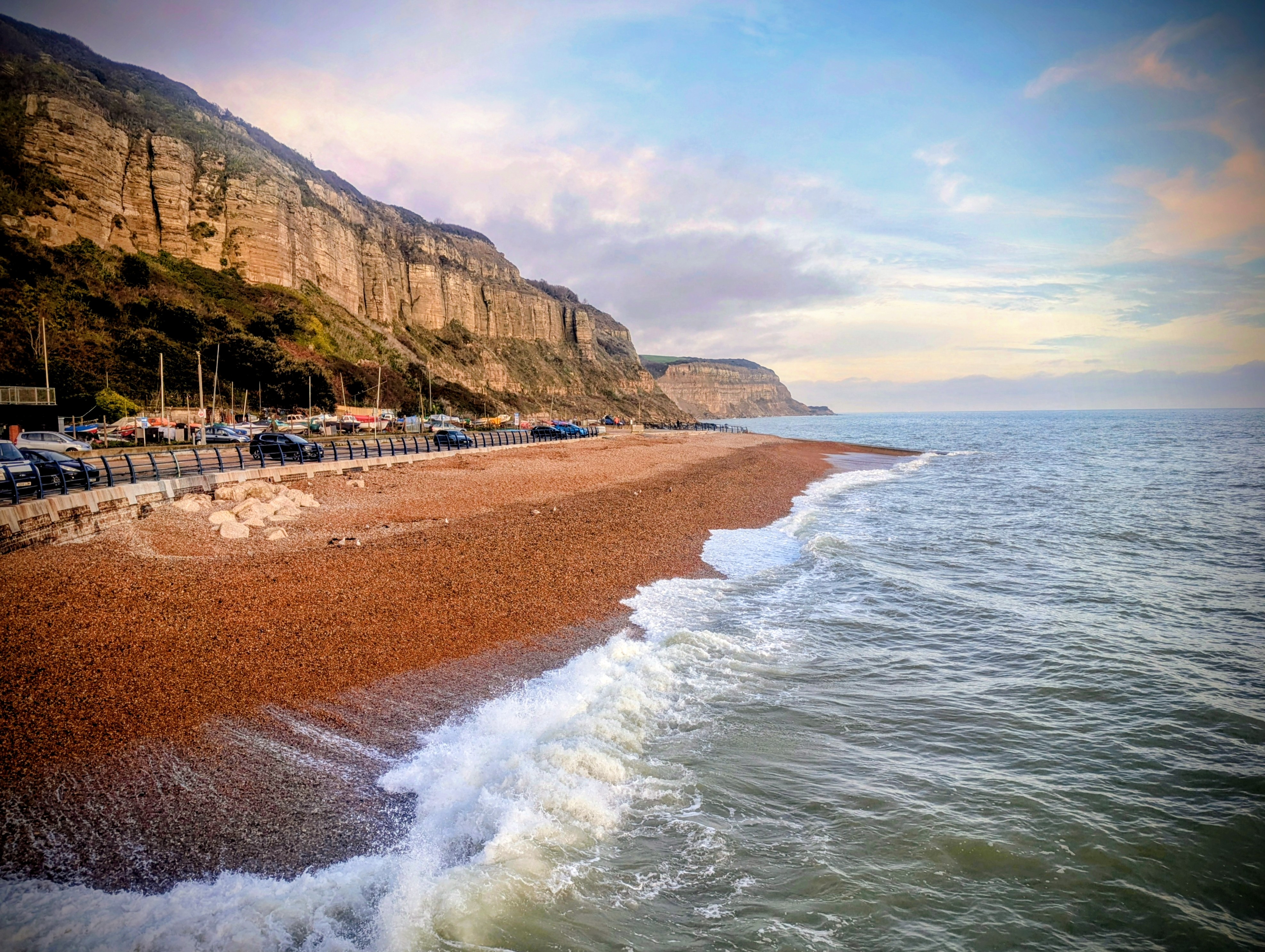 The next post-lunch stretch takes us from the brutalism of Sports Direct in Hastings New Town, past that iconic view of Pelham Crescent’s amusement arcades with the castle ruins behind,