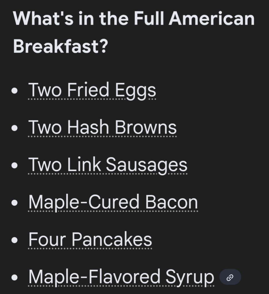 1. Just a clarification on a classic American breakfast, we NEVER have sausage AND bacon. It’s one or the other and if you order both you will certainly be charged extra.