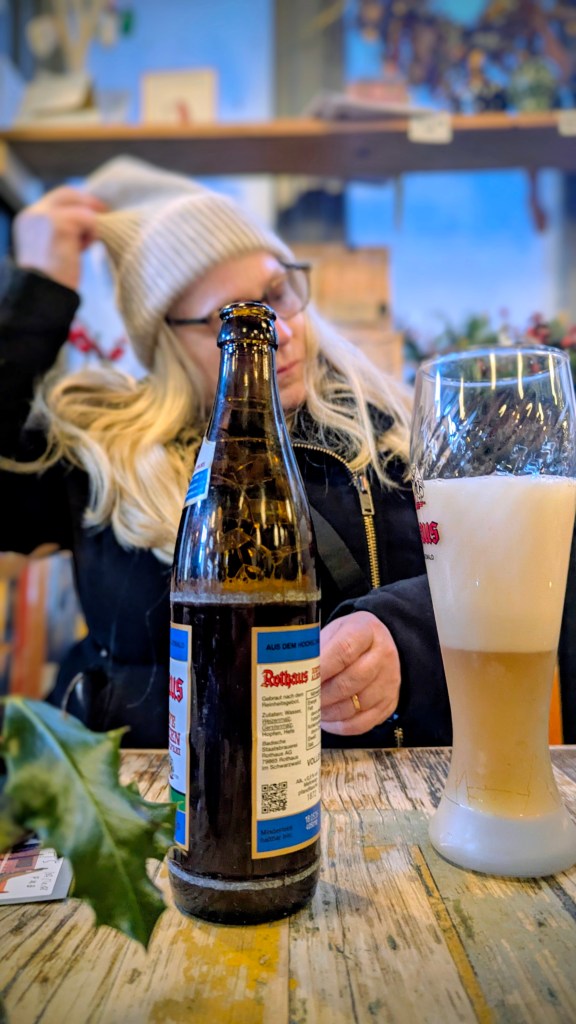 and a large bottle of Rothaus Hefeweizen NA in frosted glass for Mrs “that tastes almost beery” RM.
