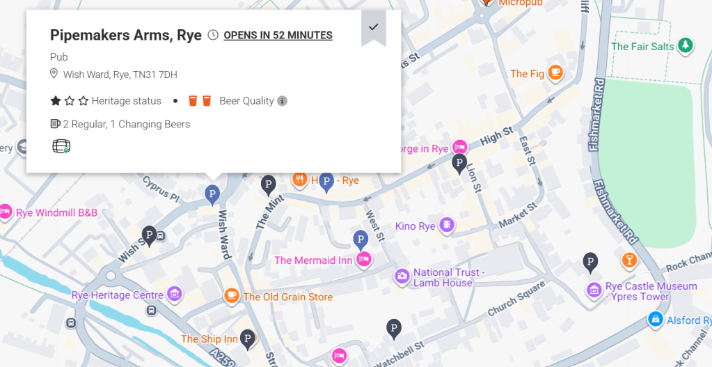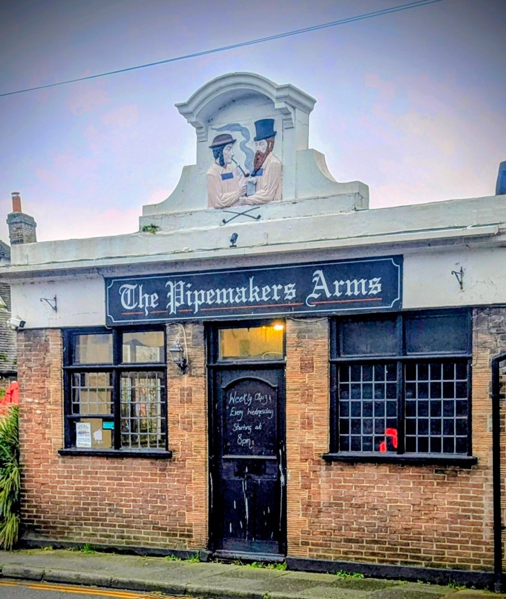 I can’t find any evidence on my blog of visiting the Pipemakers before, but I know I nipped in three years ago for a half of Harvey’s waiting for my Chinese takeaway from across the road. A takeaway I held on to even as I fell in a ditch on the walk back to Rye Harbour. The dent in the ditch still awaits repair.
