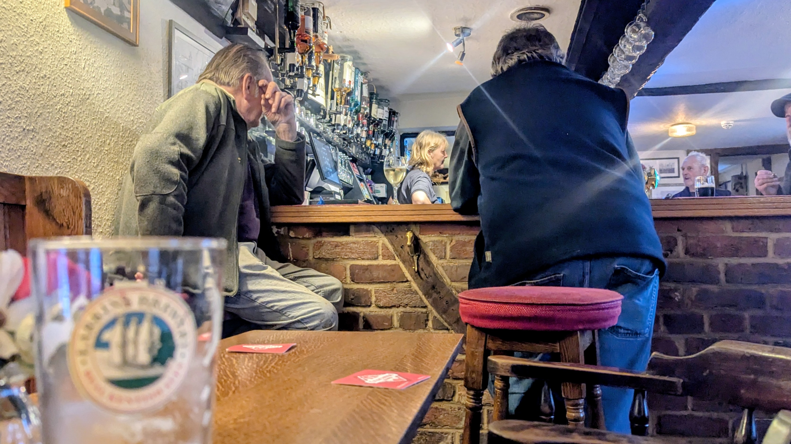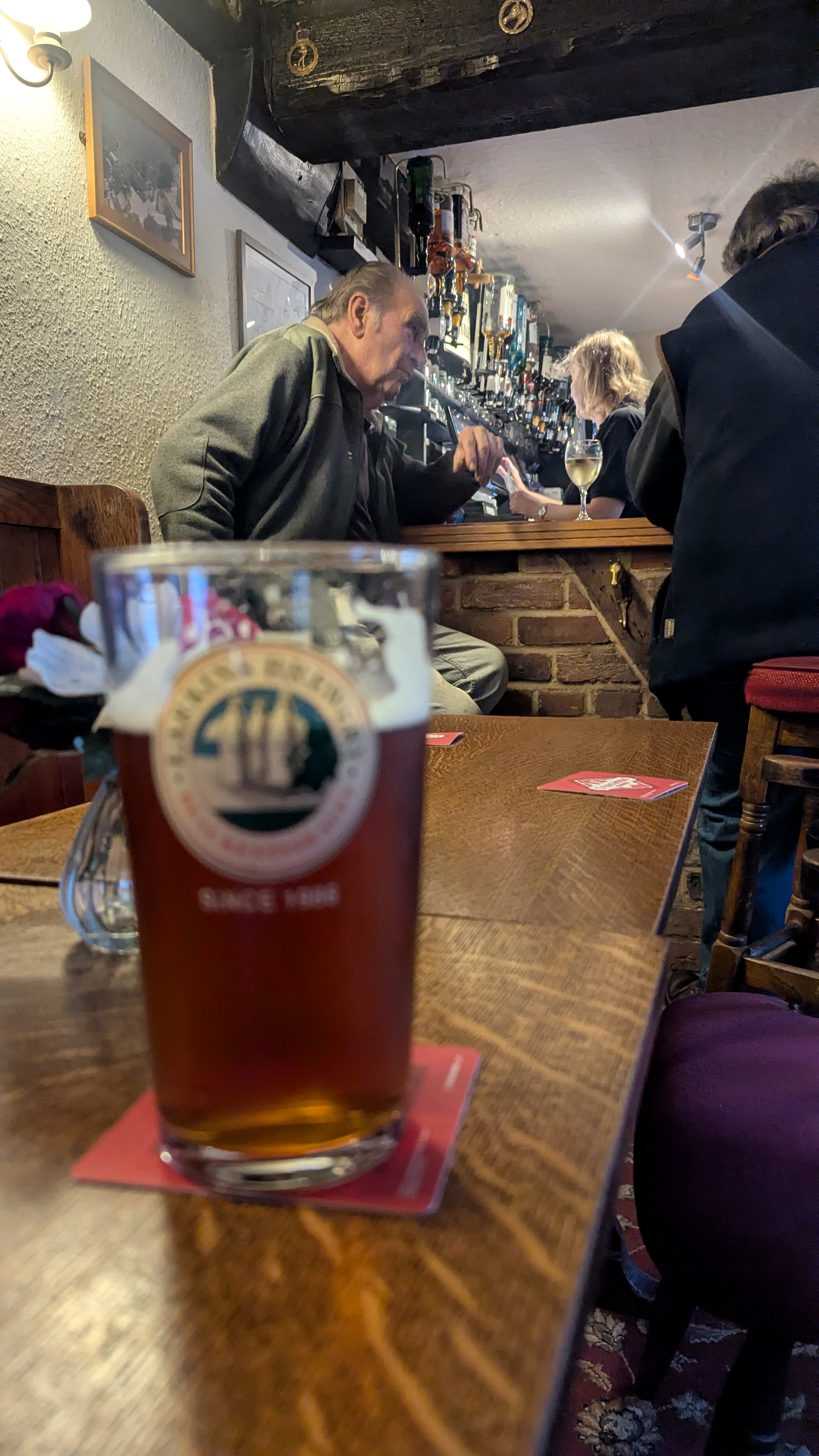 The main trade is a belated gentle folk Christmas party (NOT Kent CAMRA), hats and all, tucked round the back. We’d have had lunch here, too, but we miss last orders by 2 minutes and have to make do with poppadoms in the campervan.