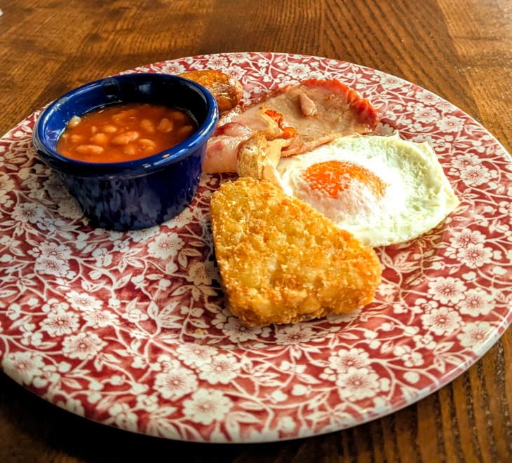 Nice that they put the beans in a little pot so they can be removed easily. Is that a sausage I see lurking behind them? If so, that’s a just about adequate breakfast.