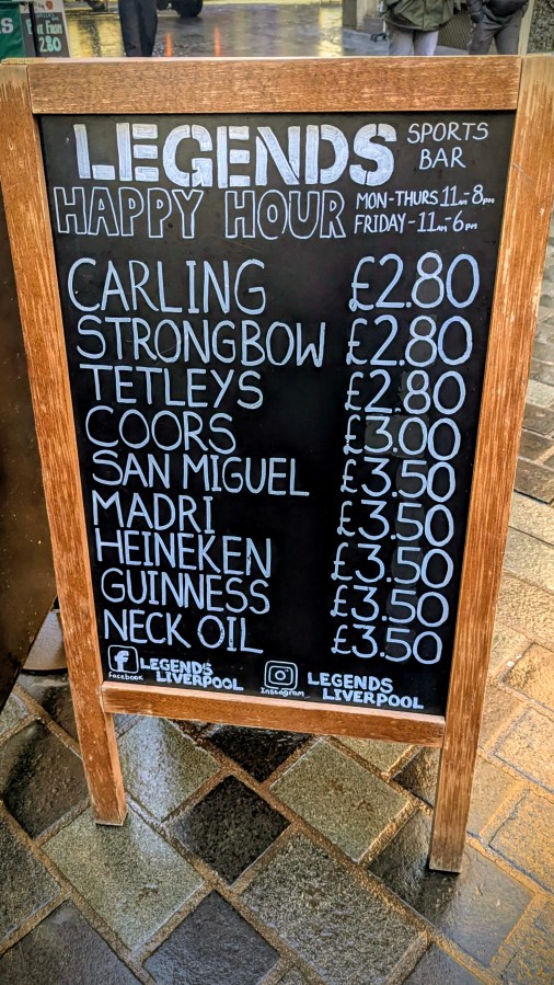 A night in Liverpool before Old Mudgie’s funeral on Friday in Widnes. He’d have been pleased with the last couple of Proper Pubs, and no doubt with the Excelsior across from my £24.99 Travelodge if I’d gone in, but I was done for the night by six.