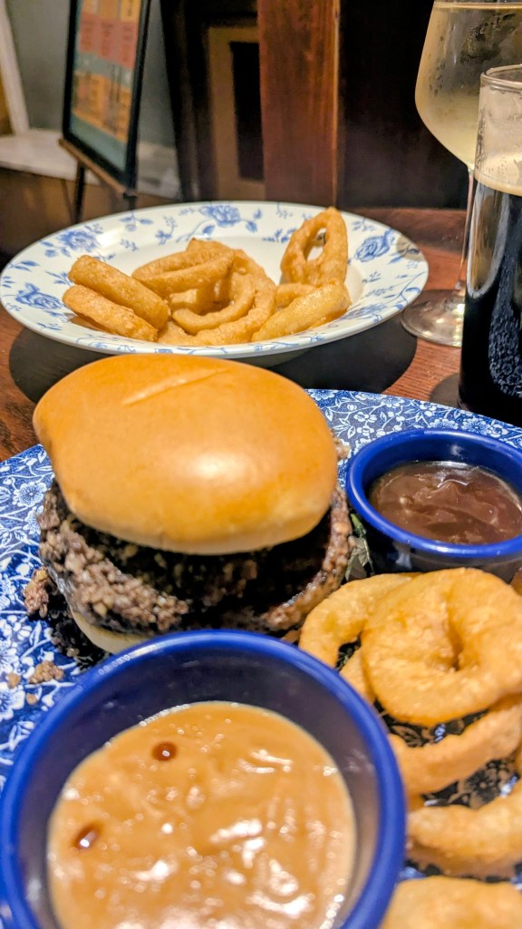 For the second time in a month. I forget that the burger already comes with onion rings, and I’m presented with eighteen (18) of them, which is the sort of Man v Food challenge you get on American TV.