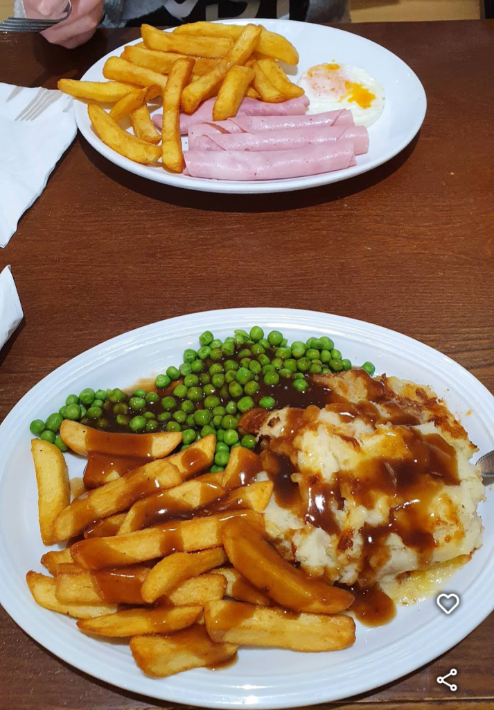 with its tempting ham egg and chips,