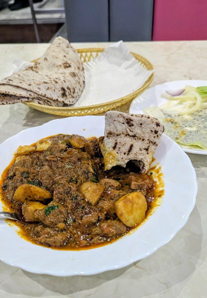 Just as people follow my every recommendation on pubs and young American songstresses, so I tend to follow Curryheute’s steer and order the Aloo Gosht with too many chapattis, which sadly is not as healthy as it sounds despite the presence of potatoes.