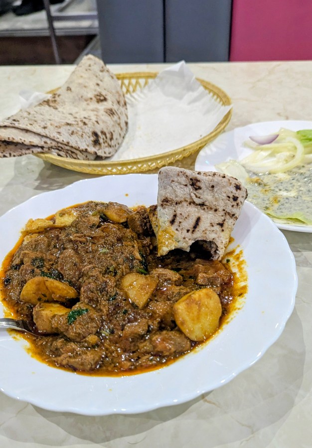 Just as people follow my every recommendation on pubs and young American songstresses, so I tend to follow Curryheute’s steer and order the Aloo Gosht with too many chapattis, which sadly is not as healthy as it sounds despite the presence of potatoes.