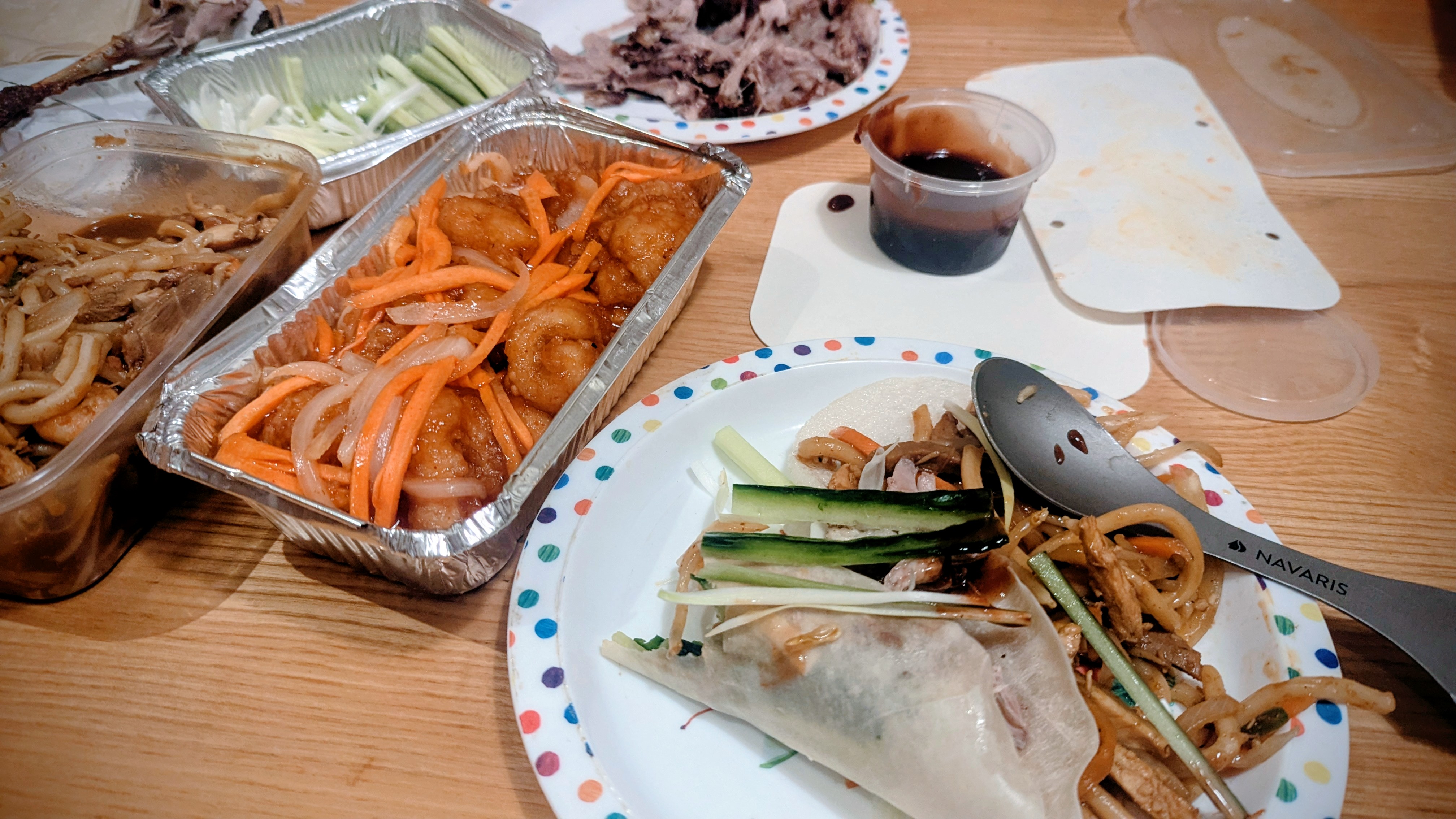 A quarter of crispy duck, spicy squid and Singapore Udon (oooh, a change !). Evene without TV and internet while we mind Sunnyside, it’s hard to beat.
