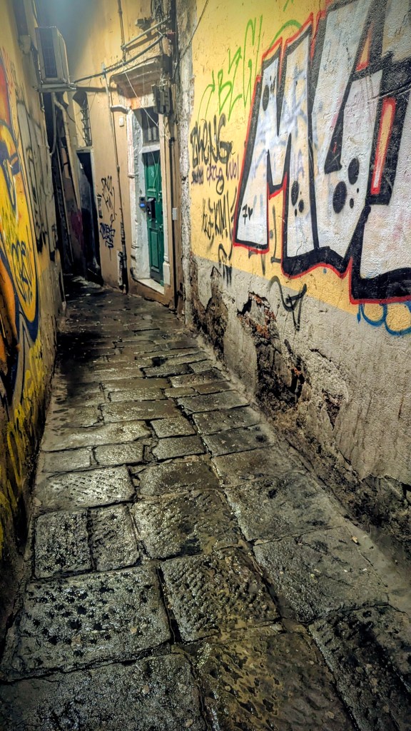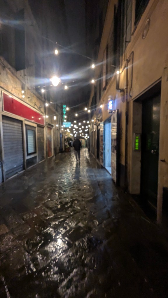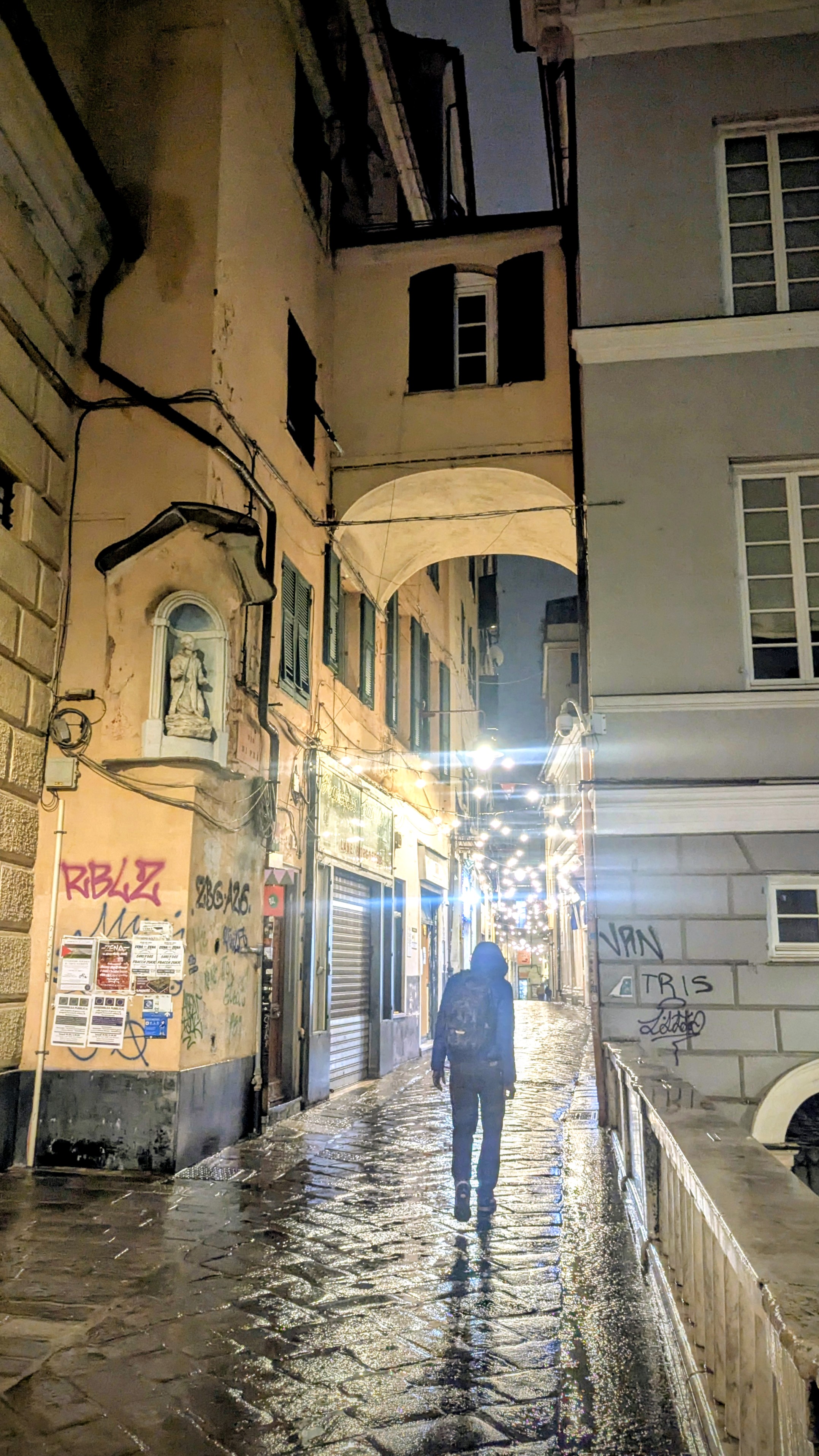 Genoa gets a lot of cruise ship business, we sailed from here ourselves to Ukraine years back, and it’s a fair bet the gentlefolk don’t spend a lot of time dressed like Bowie exploring the narrow alleys of the Old Town, but as this local confirms, you’re pretty safe in Genoa, as Via di Prè is flooded with the light of shops all night.
