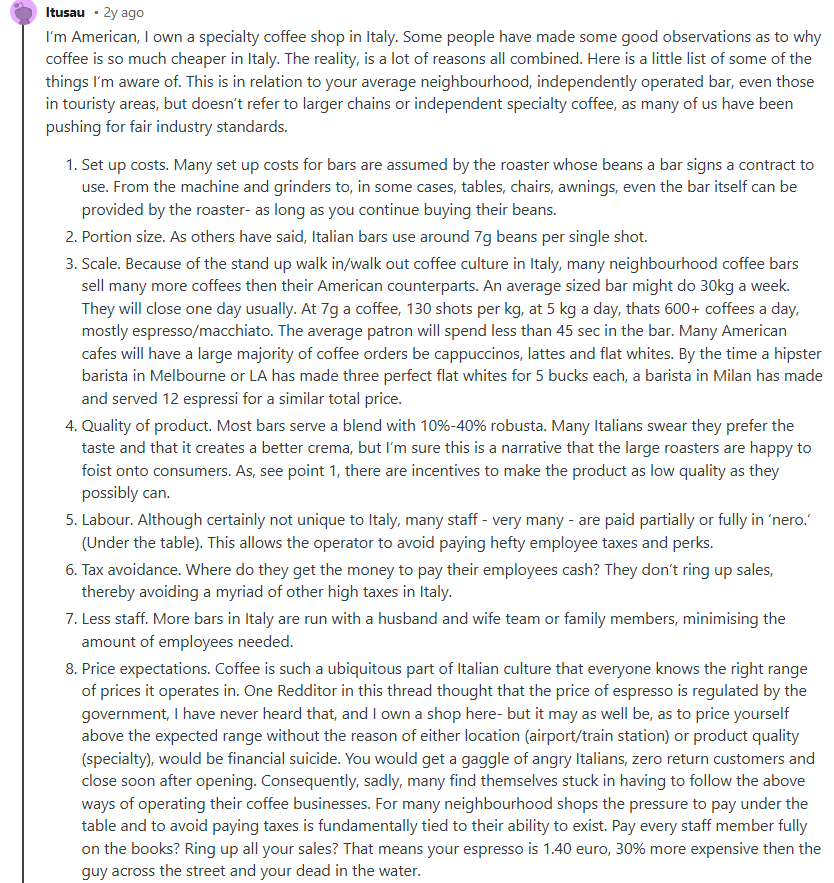 Americans seem shaken by these prices, arguing on Reddit that Italian coffee is rubbish, the locals live in squalor and they don’t pay taxes. This is the best reasoned discussion point for the 1,30 euro coffee (capuccico typically only 30 cents more);