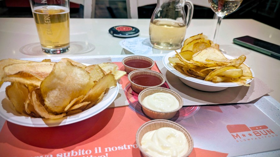 The strapline in “slow food” served fast or something, which was odd as we waited 20 minutes for the house burger, but at least the nice lady brought out the sensationally chewy potato chips early. You’ll notice what Mrs RM had with her meal deal.