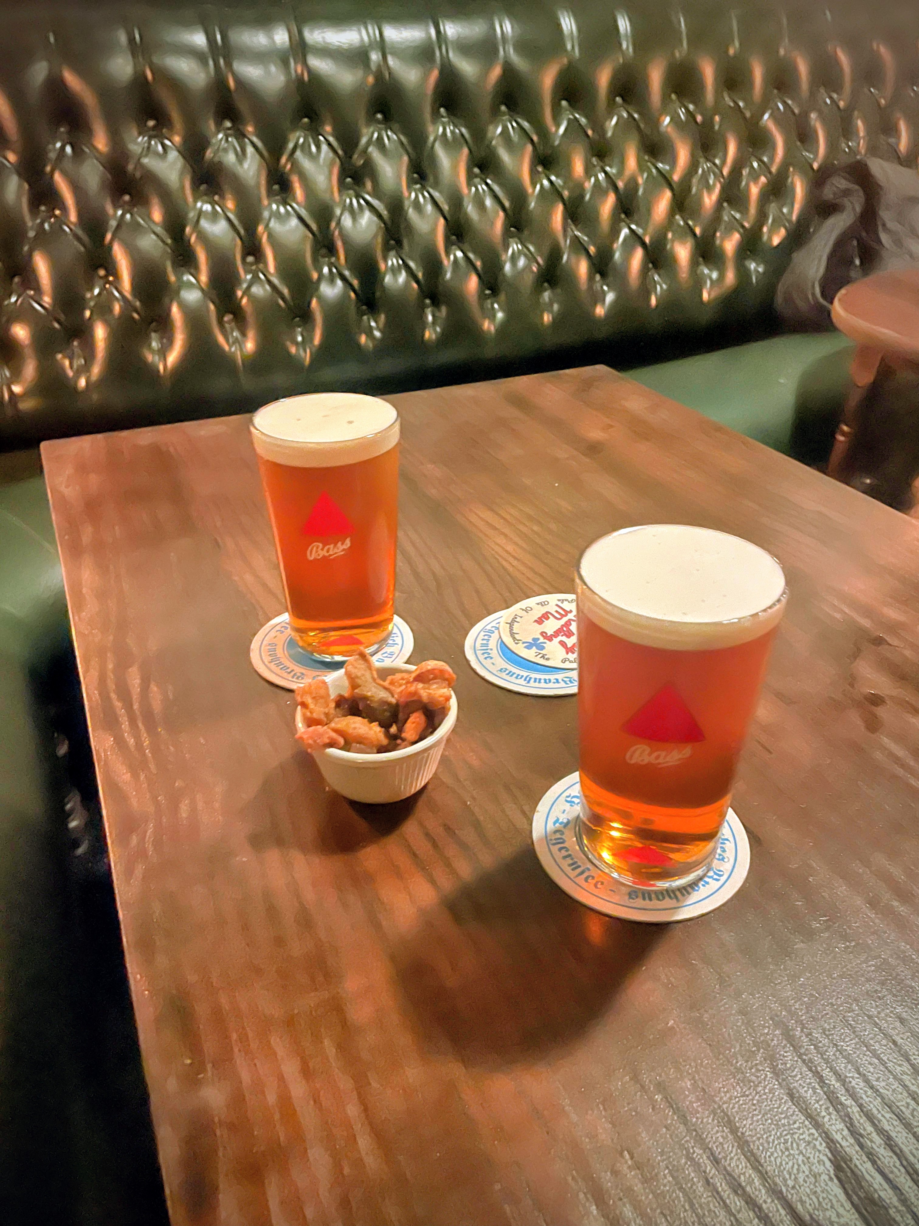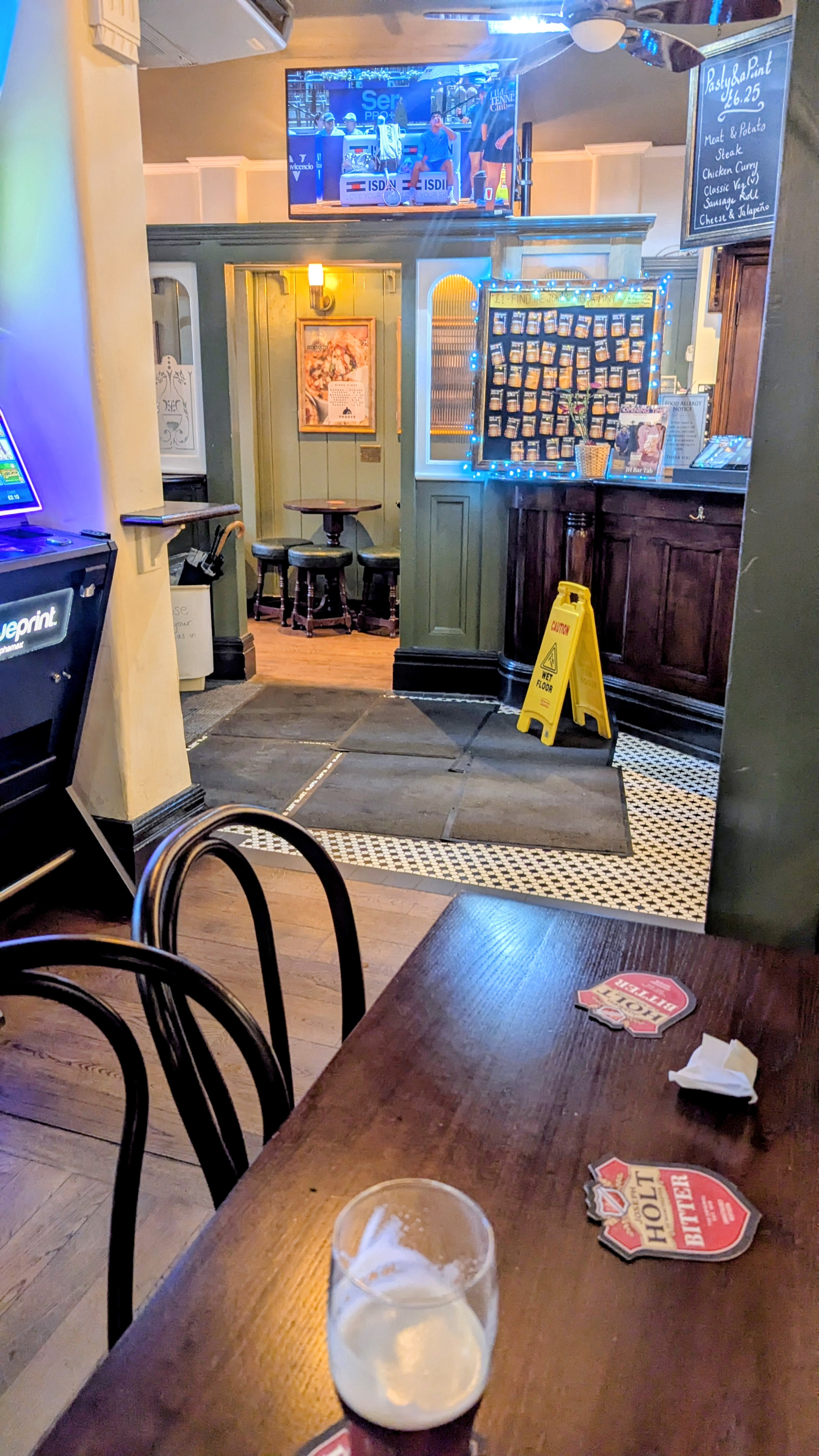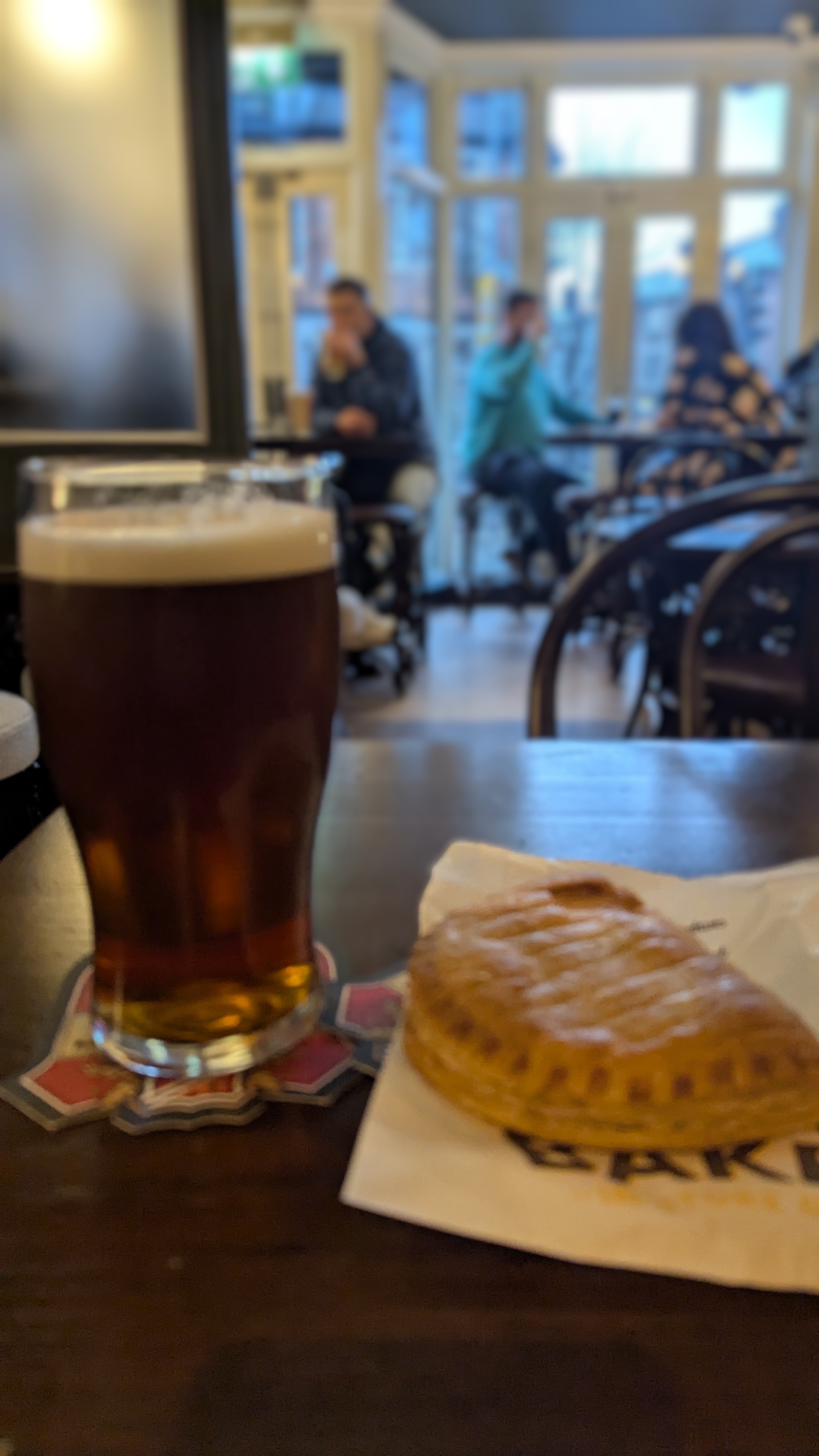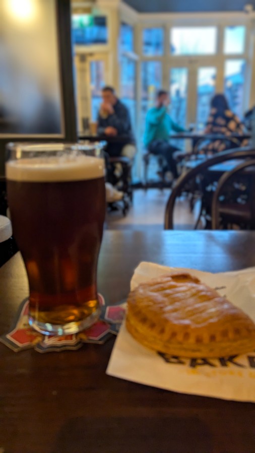 I decide on the Pint and Pasty deal; I’ve never been able to resist a deal. In truth, the cheese and jalapeno pasty is a little underwhelming compared to the impressive mess of crumbs I leave on the nice table, but the Holt Bitter is cool and smooth (NBSS 3.5).