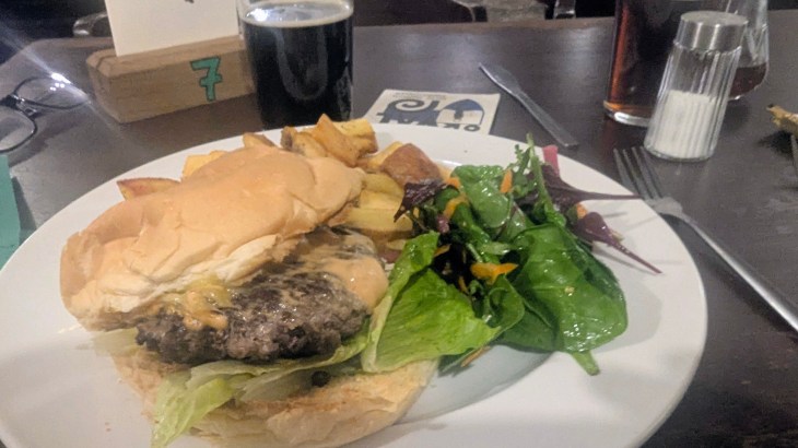 We crossed Derek Dooley Way in search of the mythical “Pub Grub” our visitor apparently wants, and find the Harlequin offering quality burgers with the beer.