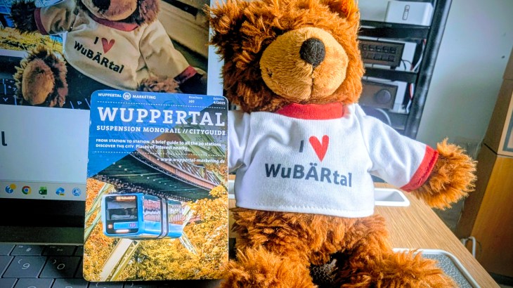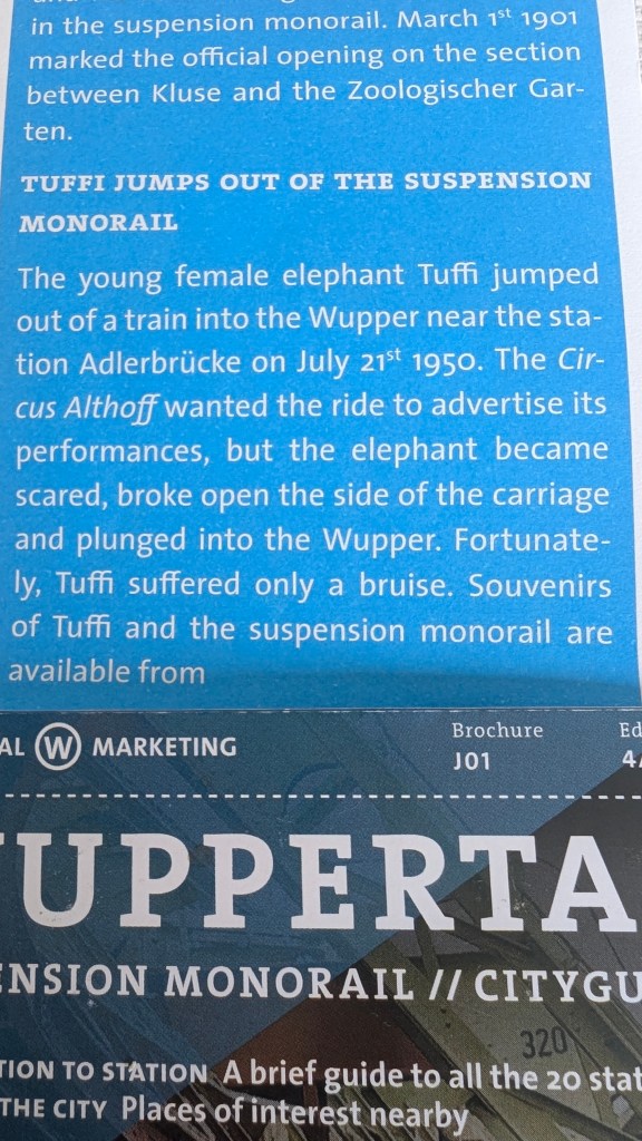 Wuppertal, then, “founded in 1929 by the merger of Elberfeld, Barmen, Ronsdorf, Cronenberg and Vohwinkel“, Wupper being the river, and the bear, that binds them together. Wuppertal is a difficult place to pin down. A bit like the Potteries, Mrs RM just agreed, with Hanley the cultural lead mirroring Elberfield.