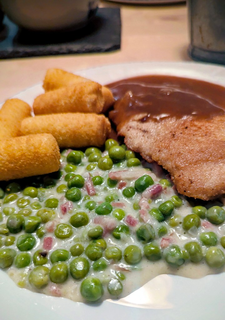 Schnitzel, croquettes, peas and bacon. The sort of pub grub you expect to see on the Black Country. Mmmm.