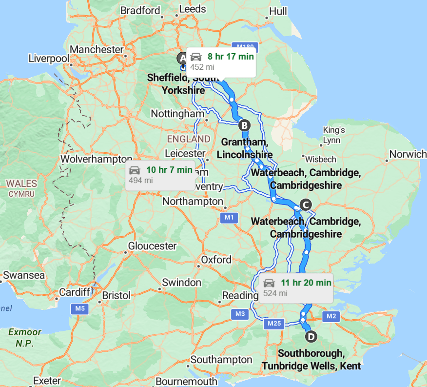 April 2026. Sheffield-Grantham-Waterbeach-Southborough-Sheffield.