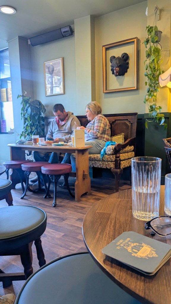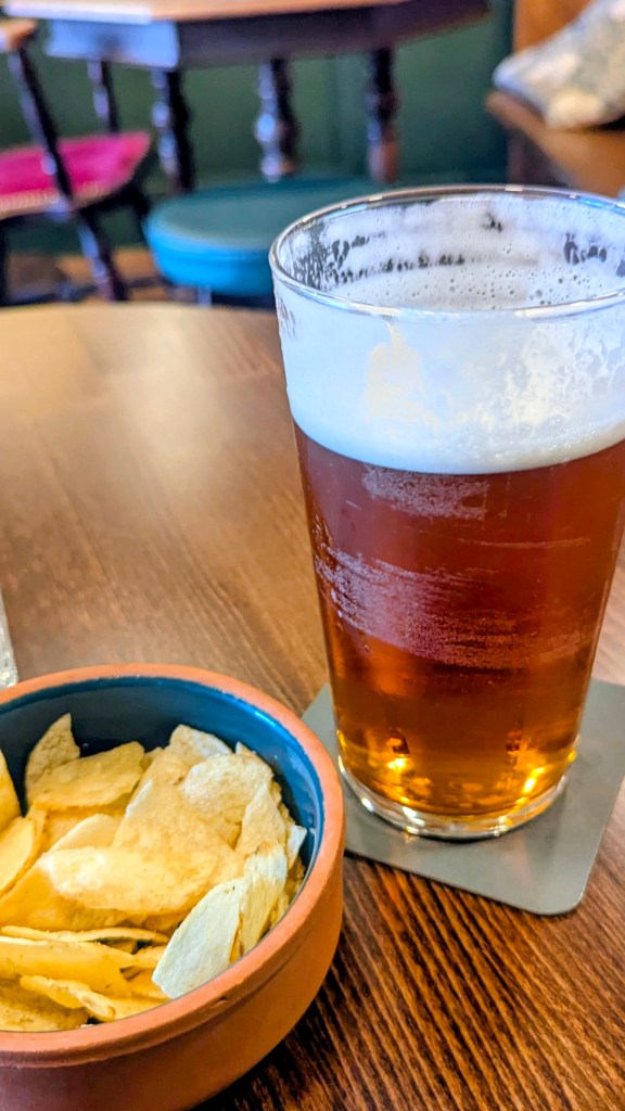 Comfy bench seating along the walls, a cool, foamy Bass (3.5) under a fiver with free crisps.
