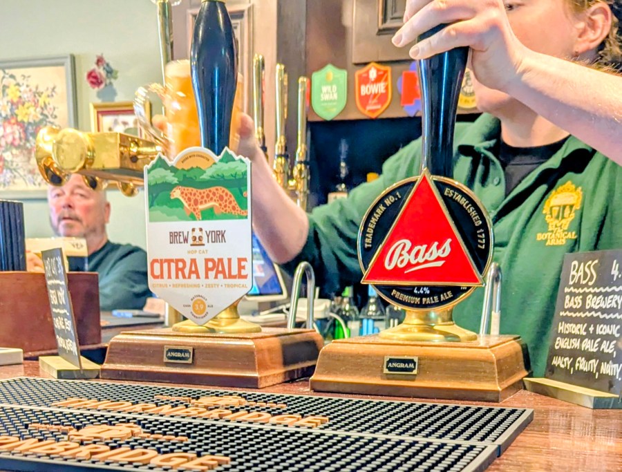 It’s a classy place, they’re playing “Wish You Were Here“, attracting the cocktail as well as cask crowd. There’s a couple of women sharing a bottle of wine, a couple sharing a pork pie with their Bass (in jug !) and murk, and a couple of blokes at the bar on the Brew York. A good mix.